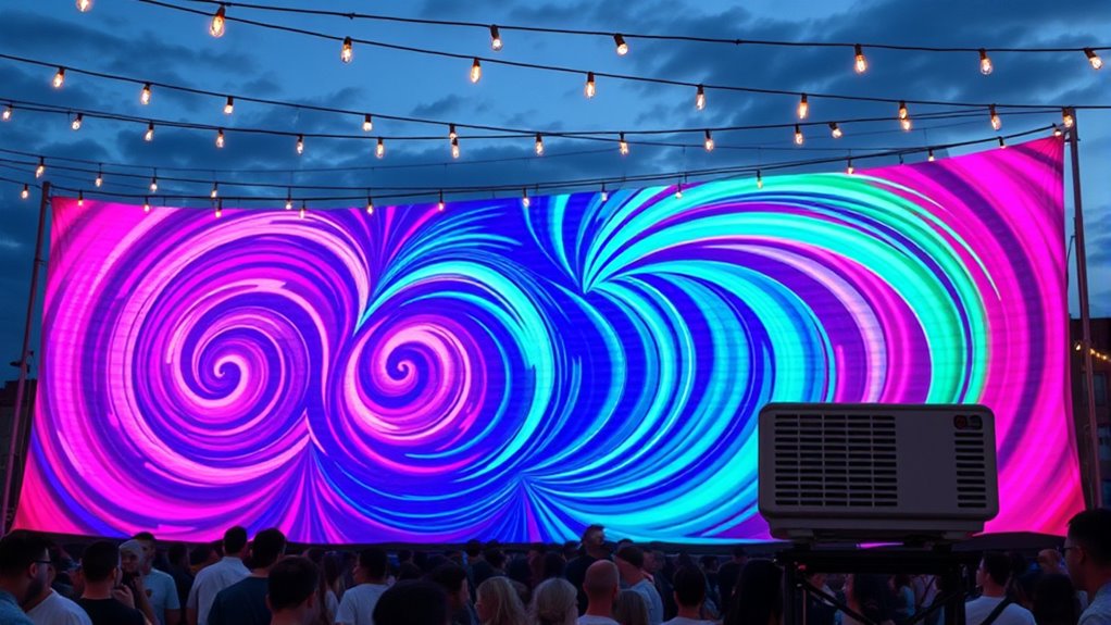 Choosing the right projector brightness for outdoor festivals hinges on understanding the ambient lighting conditions and the size of the display area. For large spaces over 1,000 square feet, I recommend projectors with at least 2,000 to 3,000 lumens to ensure the display is bright enough to be seen clearly. If your festival occurs in brightly lit environments or during daytime, you’ll want a projector with 5,000 lumens or more to maintain vivid and sharp images. Ambient light plays a significant role; darker settings require lower lumens, while well-lit areas demand higher brightness. Additionally, selecting a projector with adjustable brightness settings gives me the flexibility to optimize visibility based on changing outdoor conditions, making sure the visuals always look their best.