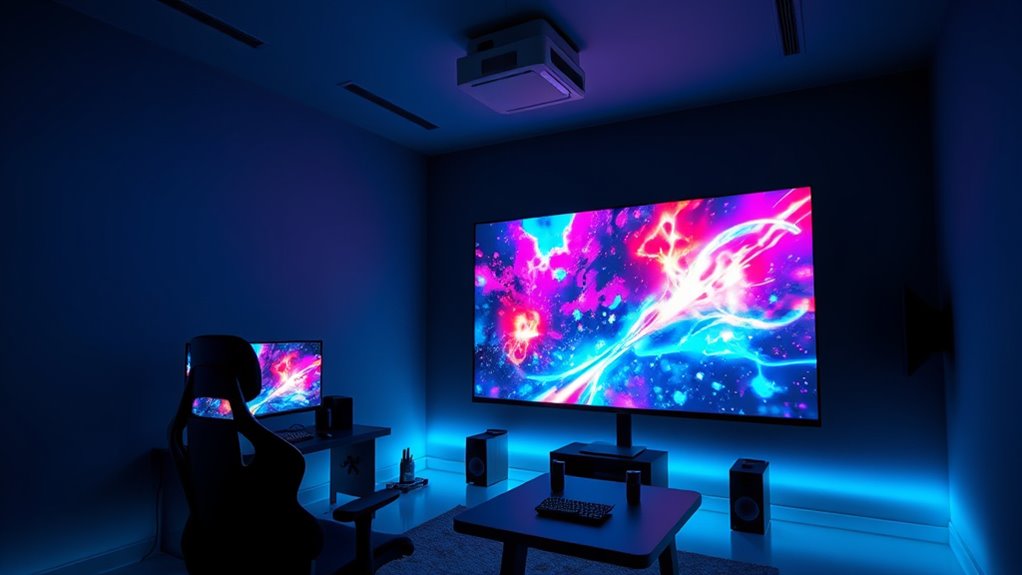 Refresh rates directly impact gaming performance by affecting how smooth the image appears. A higher refresh rate, like 120Hz or more, reduces motion blur and judder, making fast-paced action feel more fluid and responsive. Lower refresh rates can cause lag and choppy visuals, which might hinder your gameplay experience. So, when choosing a projector, I always look for one with a high refresh rate to enjoy seamless, immersive gaming sessions.