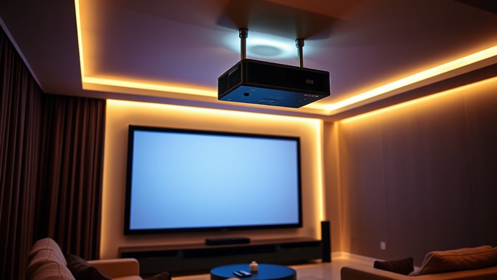 The environment where you set up your projector considerably influences how quietly it operates. Bright rooms with high ambient light often require higher brightness settings, which can cause the fans to work harder and create more noise. Proper ventilation and airflow are essential; well-ventilated spaces help keep temperatures stable, reducing the need for aggressive cooling that generates sound. Dust, temperature fluctuations, and humidity also impact cooling efficiency—excess dust and extreme conditions can make fans ramp up, increasing noise levels. Additionally, the placement of your projector matters: confined spaces or cluttered areas hinder heat dissipation, prompting fans to run louder. Operating in a stable temperature environment allows for quieter fan operation, helping you enjoy your movies without unwanted noise distractions.