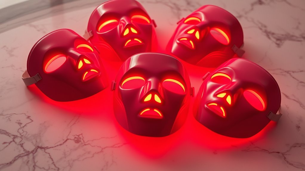 If you’re looking for the best red light therapy masks of 2025 to boost your skin’s glow and rejuvenate deeply, I recommend exploring options like masks with multiple wavelengths, adjustable modes, and ergonomic designs for comfort. Devices that cover your face and neck provide thorough treatment, and those with rechargeable batteries make at-home use easy and convenient. Keep in mind safety features and skin-friendly materials. Stick with me to discover detailed insights on the top devices perfect for your skincare goals.