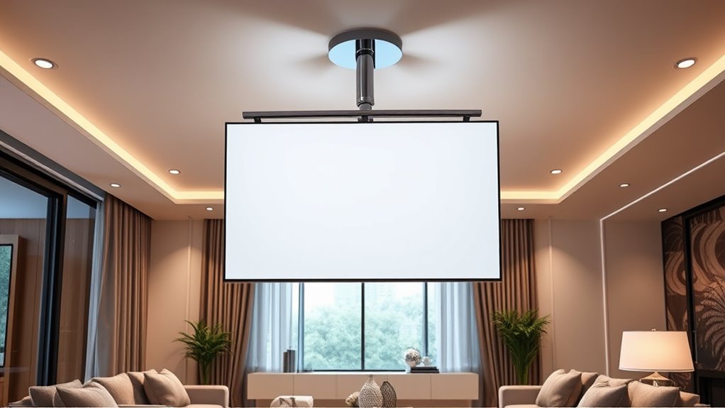 To maintain ideal viewing angles with rotating ceiling mounts, I always start by adjusting the mount so the TV is at eye level when seated. I then test different angles, ensuring the screen is comfortable to view from various spots in the room. I also consider the mount’s swivel and tilt features, fine-tuning them for smooth, precise adjustments that reduce glare and enhance picture quality.