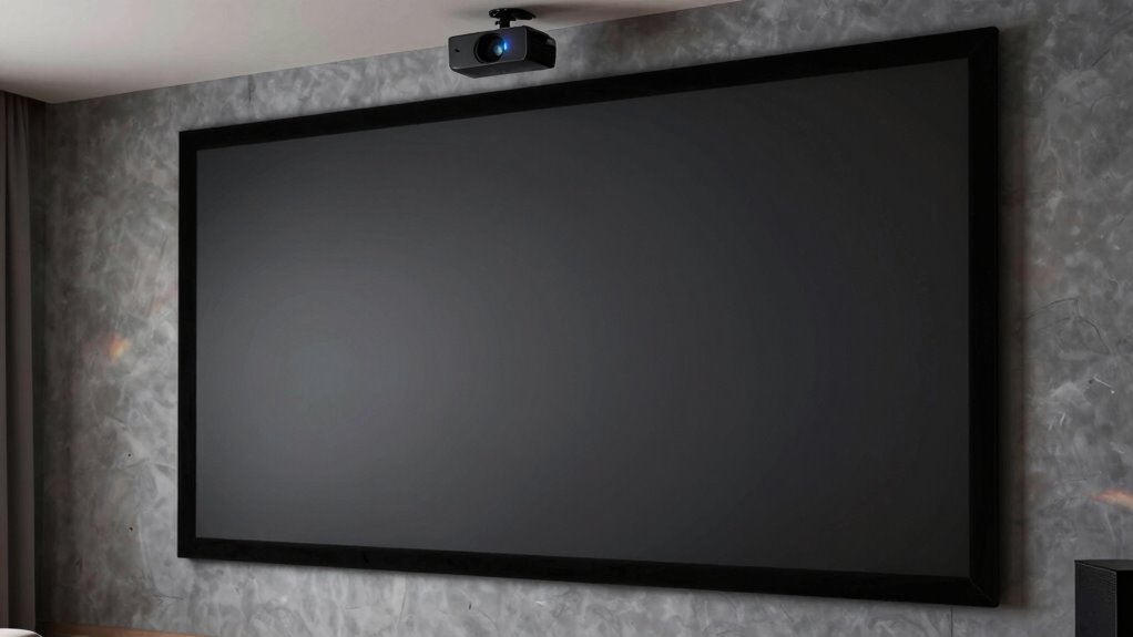 The color and finish of screen paint play a crucial role in achieving ideal projector image quality, especially in different lighting conditions. I’ve found that grey or neutral tones are often best for high contrast and accurate colors, making images pop without washing out. The finish also matters: matte finishes reduce reflections and hot spots, creating a more uniform picture in well-lit rooms. On the other hand, semi-gloss or satin finishes can boost brightness but might cause glare, which is problematic in brighter environments. When choosing, I consider how much ambient light there is and the room’s purpose. Picking the right color and finish helps optimize image clarity and contrast, ensuring a better viewing experience tailored to your space’s lighting conditions.