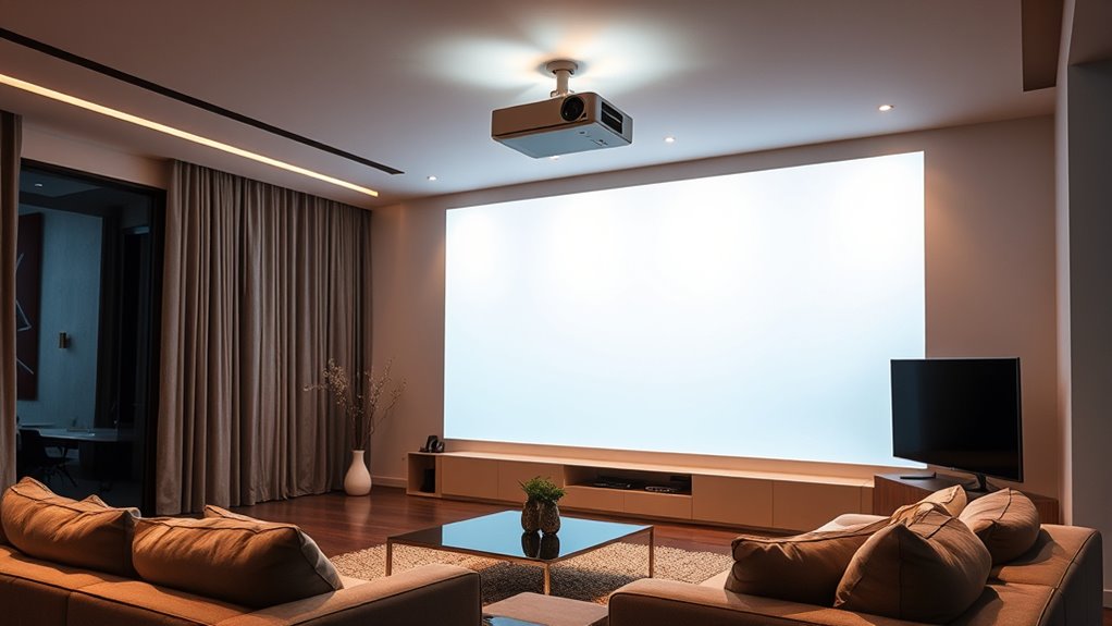 Choosing the right projector for your space depends heavily on the size of the room. Short throw projectors are perfect for small rooms because they can create large images from just 3 to 5 feet away, saving space and reducing clutter. Conversely, long throw projectors need 8 to 16 feet or more to produce a 100-inch screen, making them suitable for larger rooms or auditoriums. It’s important to take into account the available space to ensure the projector can be positioned at the proper distance without distortion or limited screen size. Additionally, adjustable zoom and keystone correction help optimize image quality in different room sizes. Making sure there’s enough room for the necessary throw distance prevents image issues and makes for a better viewing experience.