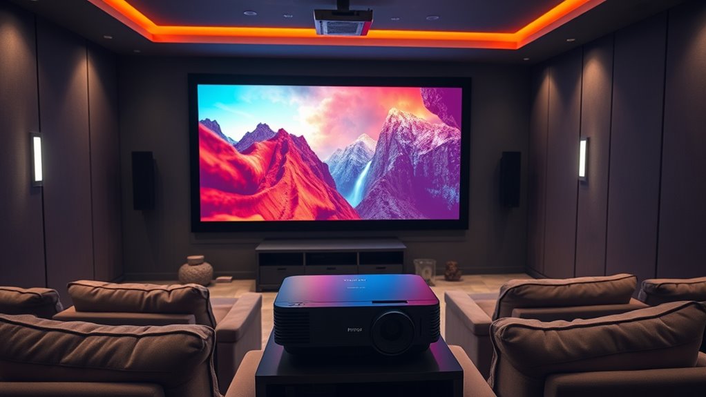 Have you considered how brightness and contrast levels can transform your home theater experience? Brightness, measured in ANSI lumens, is essential—aim for 1000+ lumens if you plan to watch during the day or in well-lit rooms. Higher brightness ensures your image remains clear and vibrant despite ambient light. Contrast ratio, like 50,000:1, influences how deep blacks and bright whites appear, adding richness and depth to your picture. HDR support enhances this further by revealing more detail in dark and bright areas simultaneously. Combining high brightness with a strong contrast ratio results in vivid, lifelike images, elevating cinematic quality. Don’t forget, adjusting contrast settings can fine-tune the visual depth, especially in environments with reflective surfaces or some ambient light.