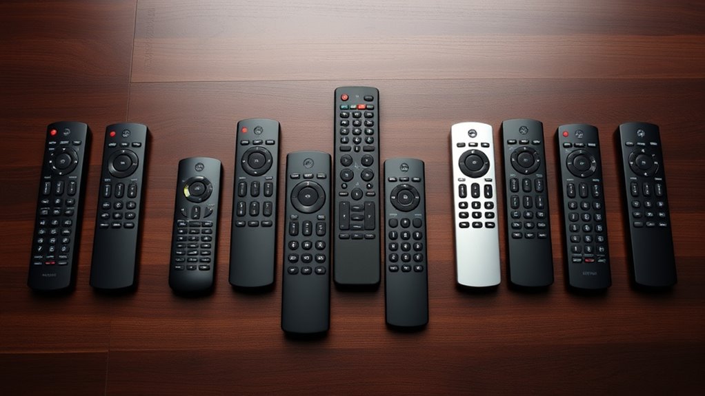 A remote’s range and signal quality are essential for reliable control, especially in larger rooms or multi-device setups. A longer range means I can operate my devices from different spots without needing to be directly in front of them. Good signal quality guarantees the remote responds consistently, even if obstacles like furniture or walls are in the way. High-quality remotes often have strong IR or RF signals, with some reaching up to 35-40 feet for dependable performance across big spaces. RF remotes generally penetrate obstacles better than IR, which needs a clear line-of-sight. For seamless use, I prioritize remotes with stable, strong signals that won’t cut out unexpectedly, making it easier to manage multiple devices without frustration or interruption.