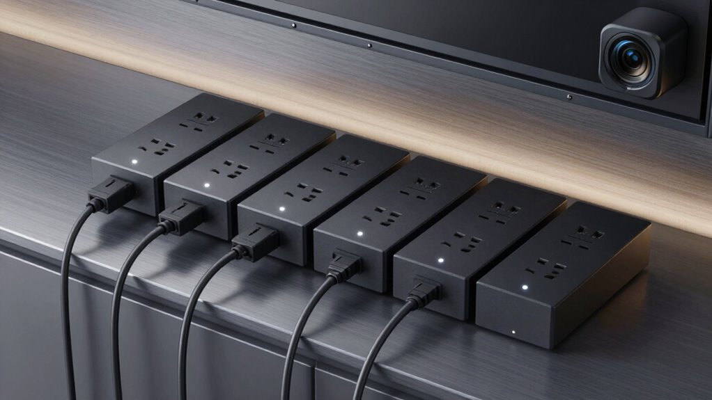 To optimize control and automation, I look for smart power strips that support remote management through dedicated apps or web interfaces, making it easy to turn devices on or off from anywhere. Voice assistant compatibility with Alexa or Google Assistant is essential for hands-free operation, especially during live setups or troubleshooting. I also prioritize models with scheduling and timer features, enabling automated on/off cycles that improve energy efficiency and device longevity. Individual outlet control is a must, so I can isolate and manage each device separately within the AV rack. Lastly, I verify support for automation protocols like SNMP, MQTT, or APIs, ensuring seamless integration with existing AV or building management systems. These features collectively enhance convenience, efficiency, and system integration.