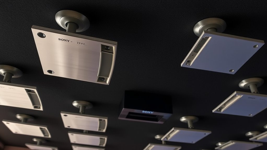 Ceiling mounts don’t directly impact audio quality, but they can improve your overall experience. By securely positioning your Sony projector or TV, they guarantee ideal screen placement, reducing glare and distortion. This setup helps create a more immersive environment, making visuals clearer and more engaging. Plus, a stable mount prevents vibrations that could subtly affect sound clarity. Overall, ceiling mounts enhance your home theater’s ambiance, making every movie feel more lifelike.