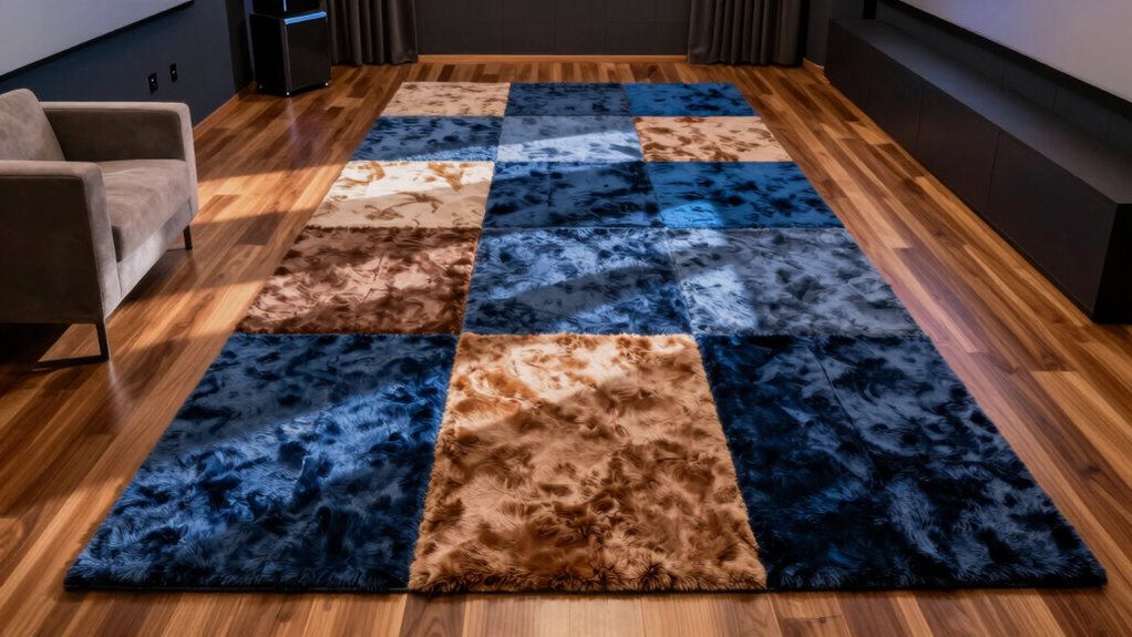 How do you determine the right size and customization options for sound-absorbing rugs in your media room? First, consider the specific dimensions you need, as mats typically range from 11 to 15.7 inches per piece. Customizable options let you tailor configurations to fit your unique layout, maximizing coverage and sound absorption. I love that many rugs feature interlocking designs, allowing for seamless connections that create a flat surface over larger areas. Make sure to calculate your total area requirements, as some mats can provide up to 23 square feet when assembled. Don’t forget about thickness; mats usually range from 0.3 to 0.4 inches, affecting both cushioning and noise dampening. Choose wisely, and you’ll enhance your media experience!