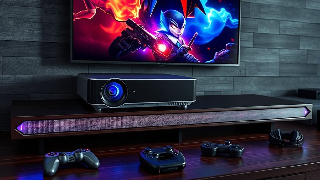 Soundbars improve gaming projector audio quality by delivering richer, clearer sound that fills the room. They enhance dialogue, effects, and music, making your gaming experience more immersive. With dedicated speakers and better sound distribution, I notice more depth and detail than with built-in projector speakers. Plus, many soundbars have features like surround sound modes and Bluetooth connectivity, which add convenience and elevate my overall gaming and viewing enjoyment.