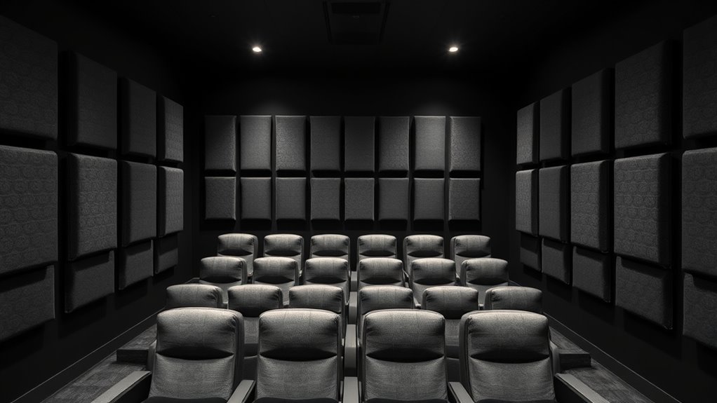 When designing a home theater, it’s important to pick soundproof panels that complement your room’s existing decor. I look for panels with a design and color that blend seamlessly into my space, maintaining aesthetic harmony. Sleek, modern styles like textured wood or fabric finishes work well, adding a sophisticated touch while serving their acoustic purpose. I also consider panels with concealed seams or integrated design features, which boost visual appeal without sacrificing sound quality. Customizable options or neutral colors help guarantee the panels don’t disrupt the room’s visual flow. Striking a balance between performance and decor is key—selecting panels that act as both effective sound absorbers and attractive interior elements helps create a cohesive, stylish home theater environment.