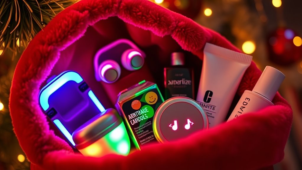 In 2025, trending tech gadgets for teen stockings include wireless earbuds with noise cancellation, compact portable chargers, and smart LED light strips for personalized room decor. I recommend checking out the latest in fitness trackers and mini handheld gaming consoles, which are perfect for quick entertainment. These gadgets are not only fun but also practical, making them perfect stocking stuffers that will definitely excite your teen this holiday season.