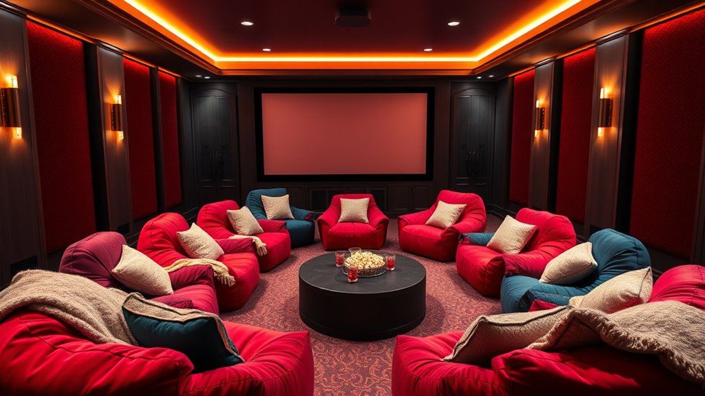 Looking for the perfect theater bean bags for cozy movie nights in 2025? I recommend checking out various sizes, like the 6FT big bean bag for spacious comfort or the extra-large chairs supporting adults and teens. Portable inflatable options are ideal for outdoor gatherings, while plush covers ensure easy maintenance. To find your ideal fit, consider support, durability, and style. Keep exploring to discover detailed insights on each top choice.