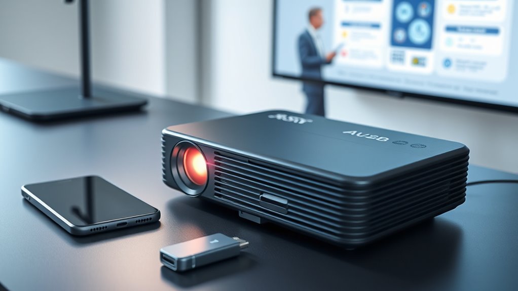Security shines softly with wireless USB projectors. I’ve found they often feature robust protections like WPA2 encryption, secure Wi-Fi connections, and user authentication options. Many also include privacy filters and device pairing controls, preventing unauthorized access. These features give me peace of mind, knowing my presentations are protected from prying eyes and potential breaches. With these security features, I can confidently connect and present, keeping sensitive information safe and sound.