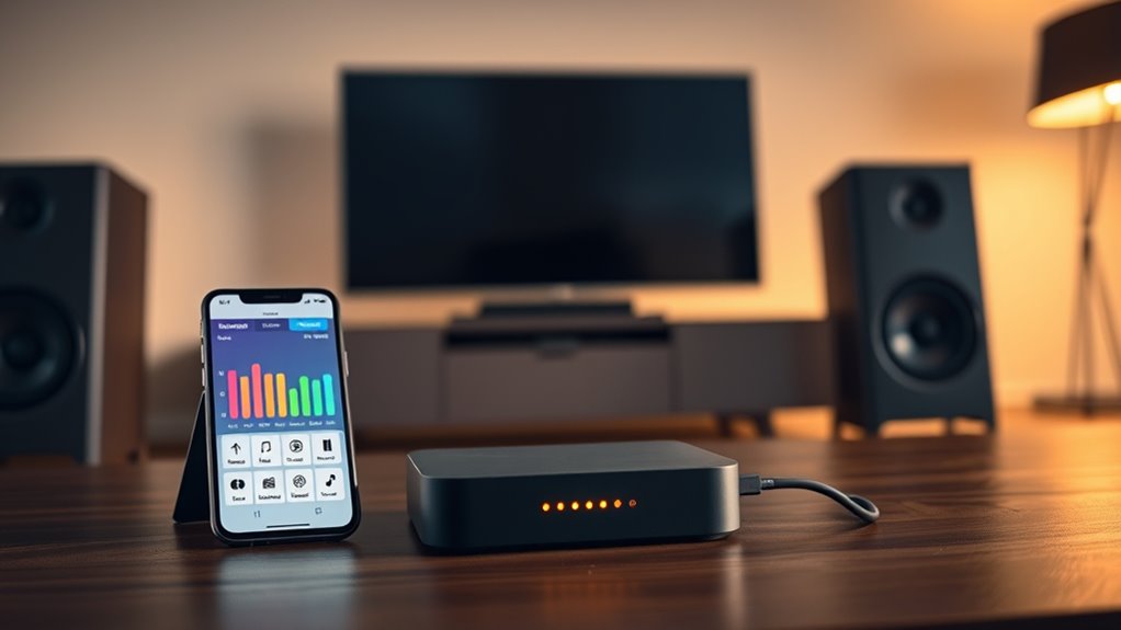 Wireless audio bridges handle interference mainly through advanced frequency management and noise-canceling technology. I’ve seen models that automatically switch channels or use encrypted signals to avoid disruptions from other devices like Wi-Fi or Bluetooth gadgets. These features help maintain a stable connection, ensuring seamless audio streaming. So, if you pick a high-quality bridge with these capabilities, you’ll experience less interference and more reliable sound quality, even in busy environments.