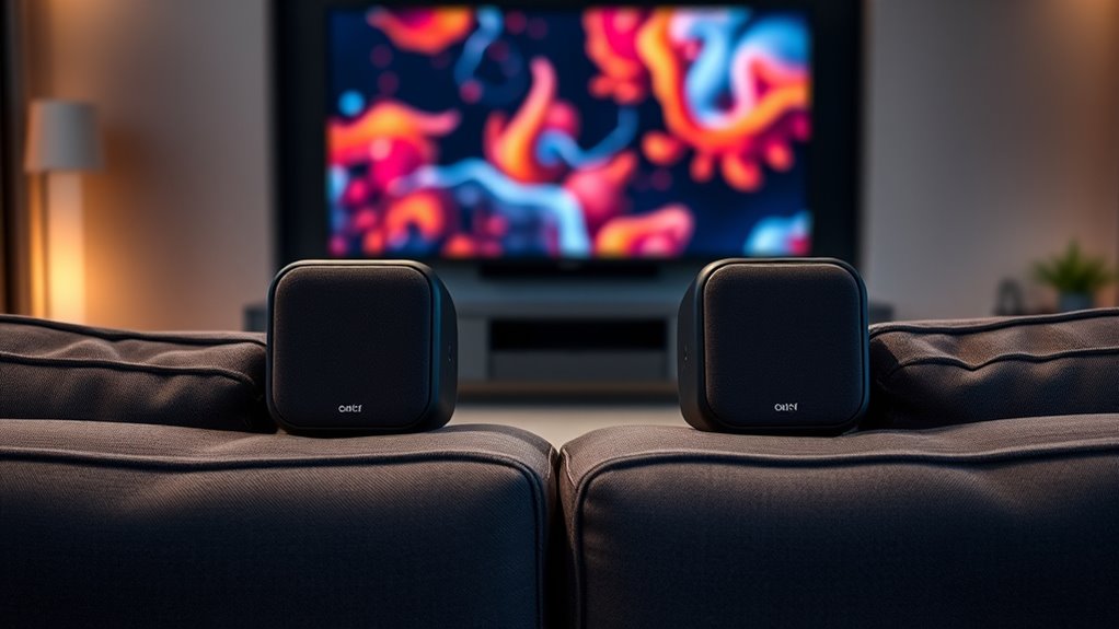 Wireless rear speaker latency can cause audio delays, making sound and picture feel out of sync. I’ve noticed that even small delays can disrupt the immersive experience, especially during movies or gaming. To avoid this, I look for speakers with low latency or those that support audio synchronization features. Ensuring a stable, fast wireless connection helps maintain crisp, synchronized sound, keeping my viewing experience seamless and immersive.