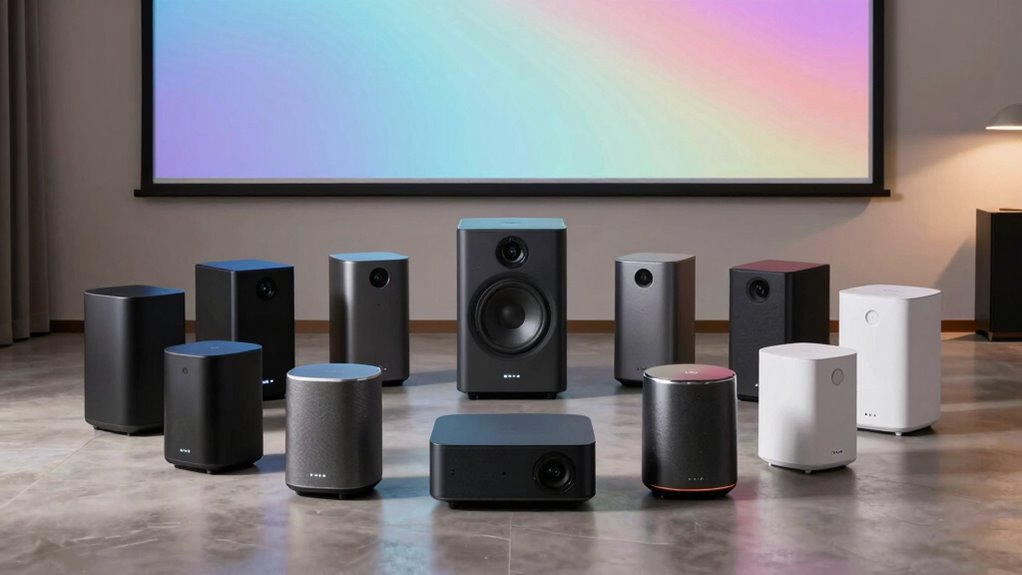 Choosing a wireless subwoofer that seamlessly integrates with your projector setup hinges on its compatibility with your audio system’s output options. First, verify the subwoofer supports the same connections as your projector, like HDMI ARC, optical, or Bluetooth. It’s also essential to check if the sub supports the same audio formats, such as Dolby Digital or DTS, for smooth sound integration. Additionally, verify that the wireless transmission technology, like 5GHz Wi-Fi, is compatible with your projector or audio system. Pay attention to the connection range to match your room’s size, preventing signal dropouts. Finally, confirm that the setup process aligns with your projector’s control system, enabling synchronized operation and easy adjustments for a hassle-free experience.